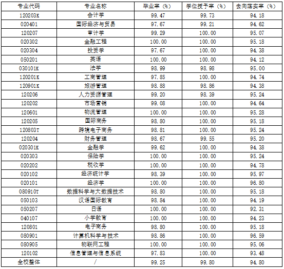 3.应届本科生毕业率、学位授予率及初次就业率较高。应届本科生毕业率和学位授予率分别达到 99.25%、99.80%,毕业生去向落实率达到 94.80%(详见表 6)。