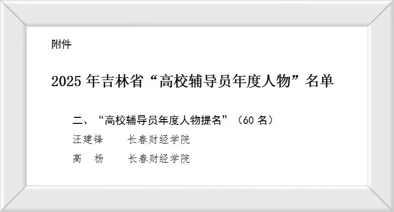 近日,2025年吉林省“高校辅导员年度人物”推选展示活动评选结果揭晓,我校人工智能学院党总支书记汪建锋、会计学院党总支书记高杨荣获2025年吉林省“高校辅导员年度人物提名”奖。