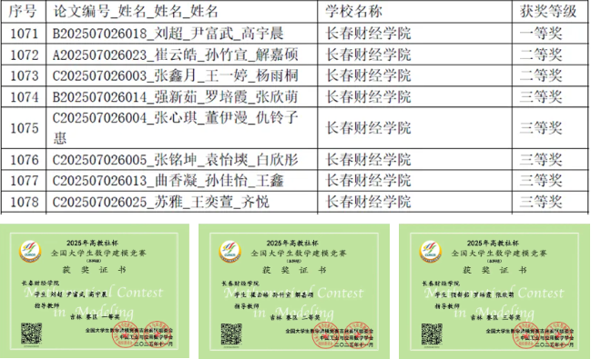 近日,中国工业与应用数学学会主办的“2025年高教社杯全国大学生数学建模竞赛”成绩揭晓,我校获得吉林赛区一等奖1项、二等奖2项、三等奖5项,位居吉林省民办高校前列。