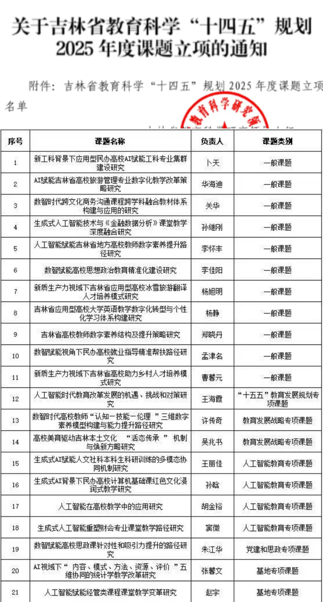 近日,吉林省教育科学研究领导小组发布了《关于吉林省教育科学“十四五”规划2025年度课题立项的通知》,经吉林省教育科学研究领导小组批准,我校21项课题获批立项,其中:一般课题11项,“十五五”教育发展规划专项课题1项,教育发展战略专项课题2项,人工智能教育专项课题4项,党建和思政专项课题1项,基地专项课题2项,立项数量较上一年度实现翻倍增长,居省内民办高校前列。