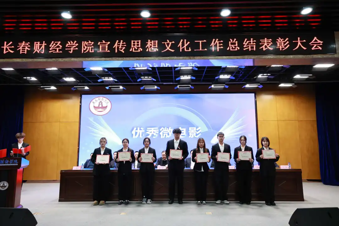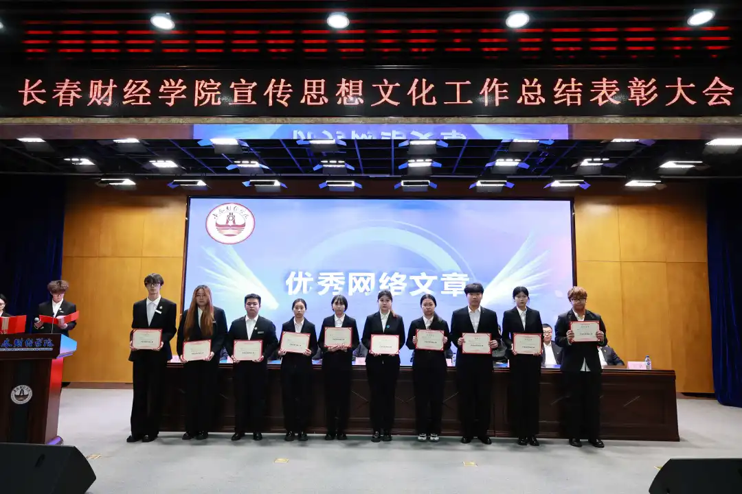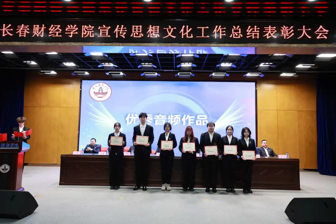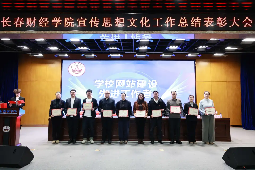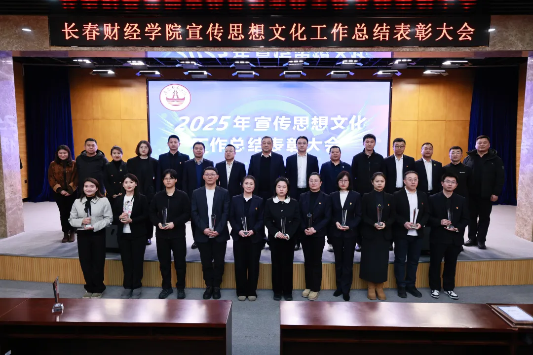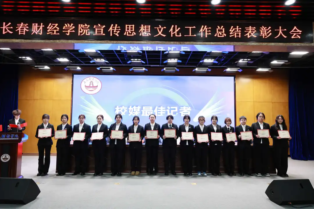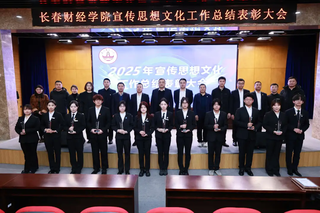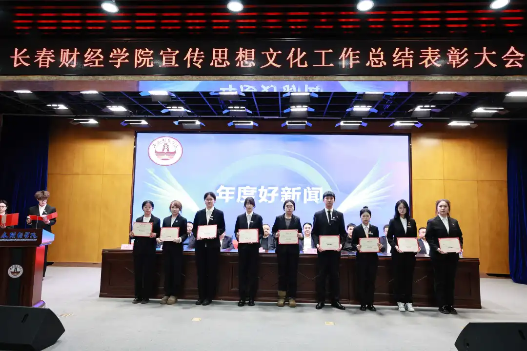 王悦宣读《长春财经学院2025年度宣传思想文化工作总结表彰决定》。大会对先进集体、个人及优秀作品进行表彰。