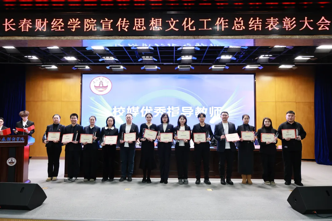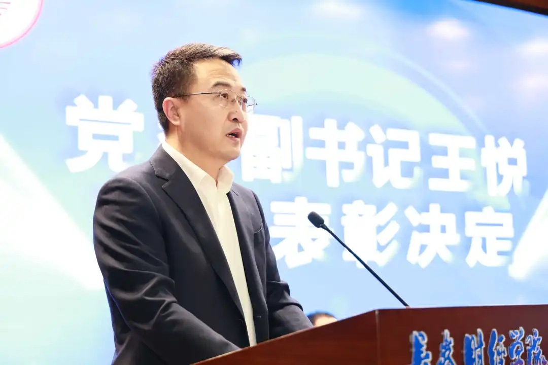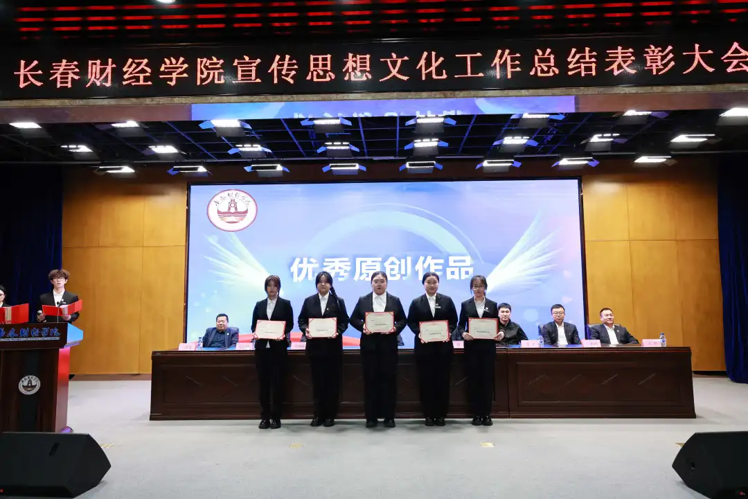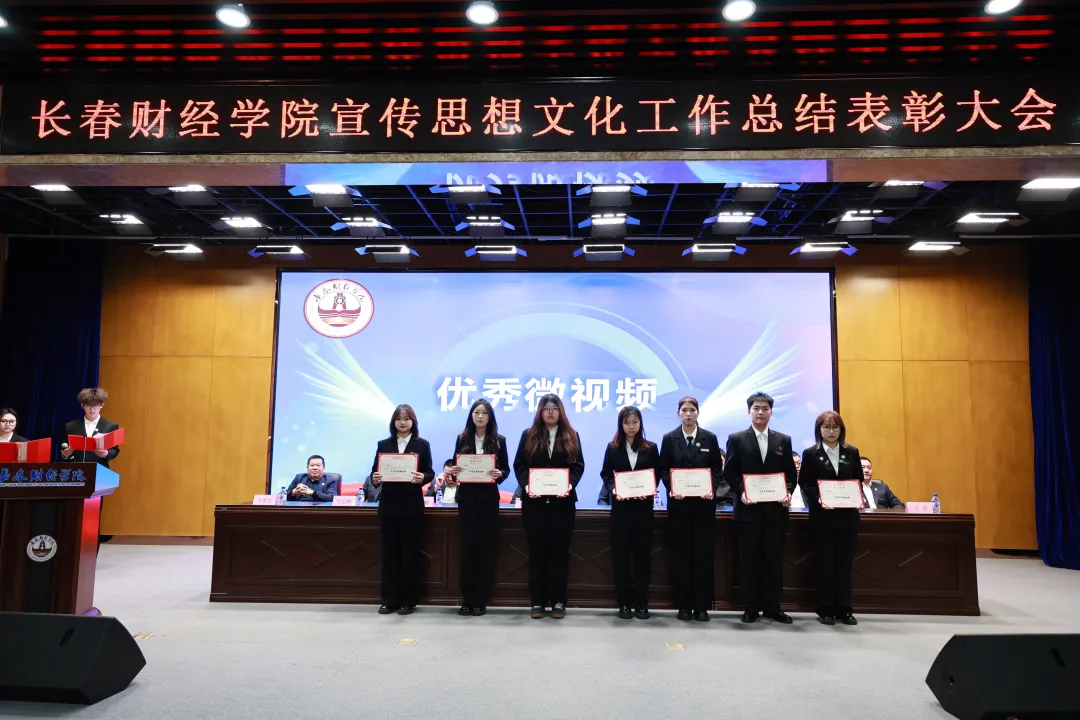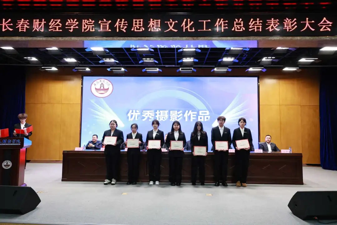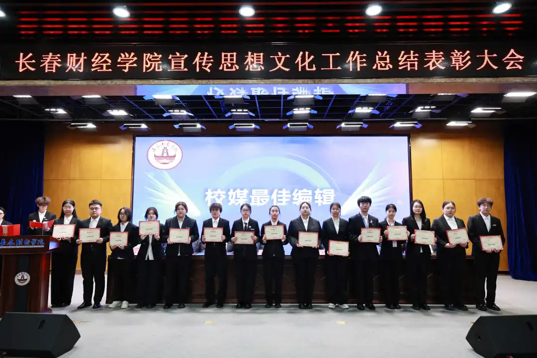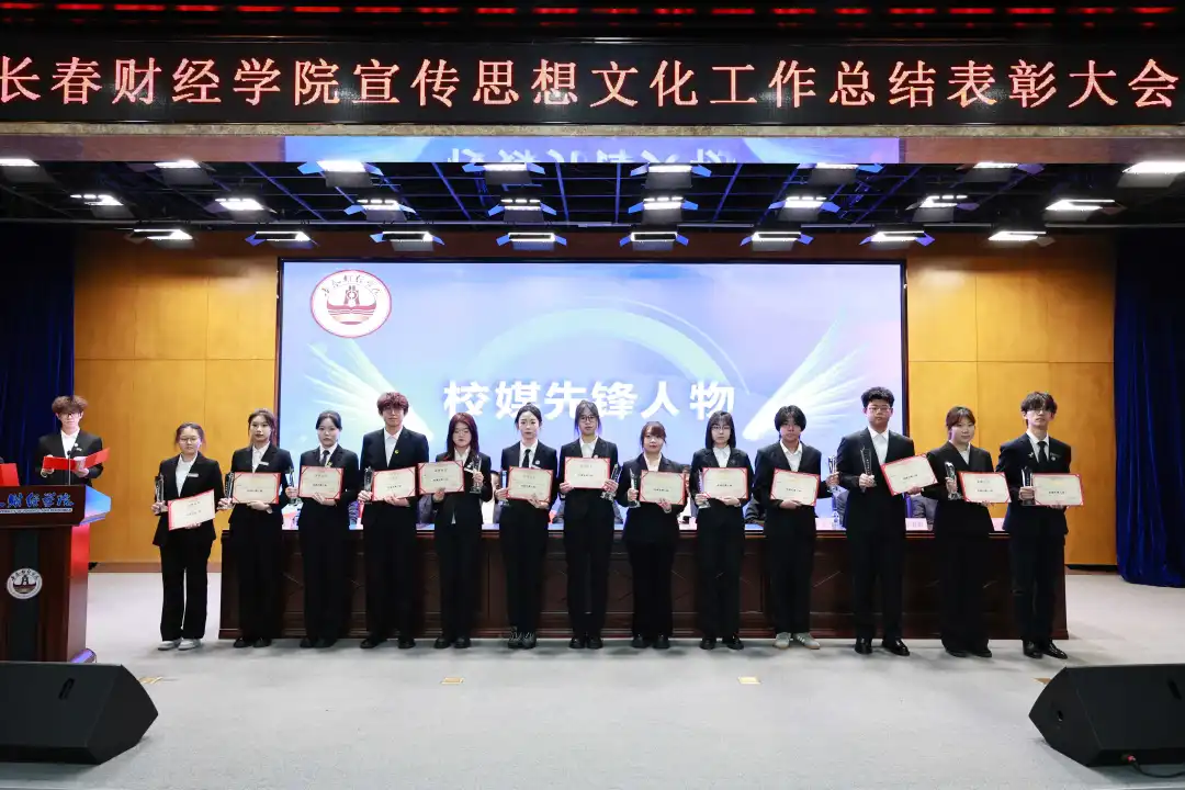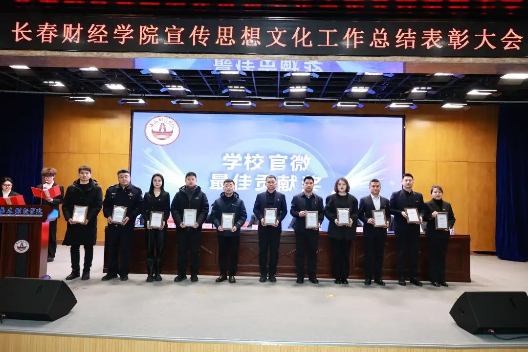 王悦宣读《长春财经学院2025年度宣传思想文化工作总结表彰决定》。大会对先进集体、个人及优秀作品进行表彰。