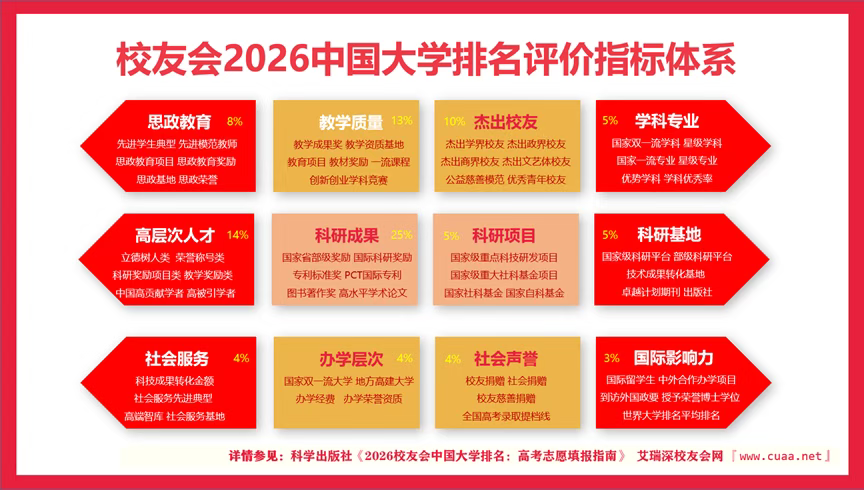 校友会2026中国大学排名评价指标体系由办学层次、思政教育、教学质量、高层次人才、杰出校友、学科专业、科研基地、科研项目、科研成果、社会服务、社会声誉和国际影响力等12大一级指标组成,基于“大平台、大团队、大项目、大成果、大校友”体系框架展开系统评价,涵盖的评价指标达900多项。校友会中国大学排名坚决贯彻落实国家教育改革文件方针政策,坚持正确的教育评价导向与价值取向,是国内第三方大学评价的引领者。