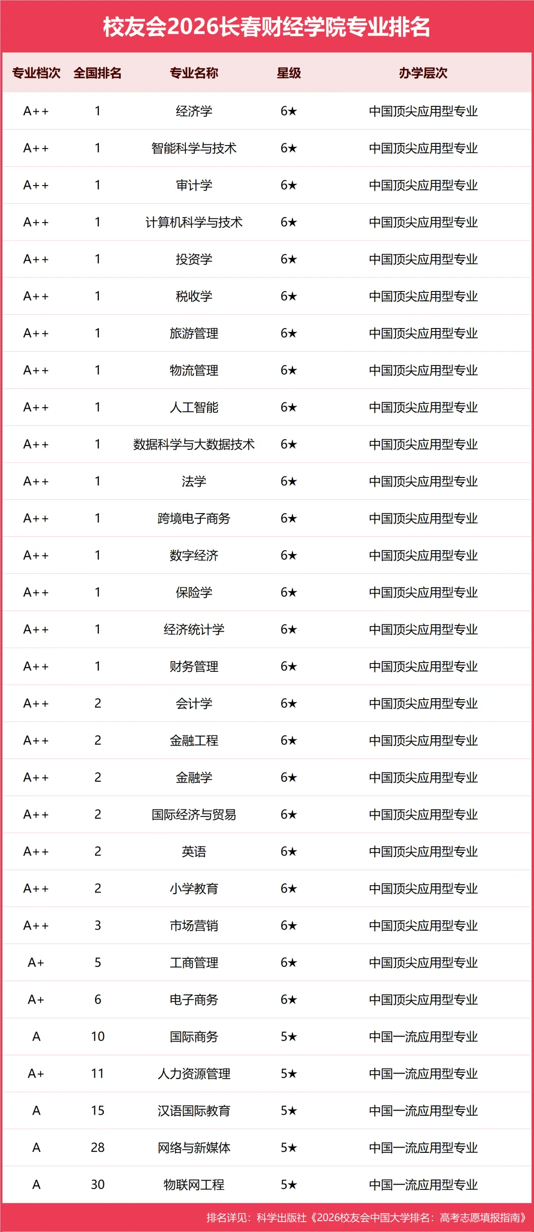 近日,全国第三方大学评价机构艾瑞深校友会网(Cuaa.net)撰写完成、科学出版社出版的《2026校友会中国大学排名:高考志愿填报指南》正式发布,长春财经学院在多个维度排名中表现亮眼,16个专业荣膺全国一流专业排名(应用型)第一,综合排名位列全国民办高校第五,全面彰显了学校办学实力。
