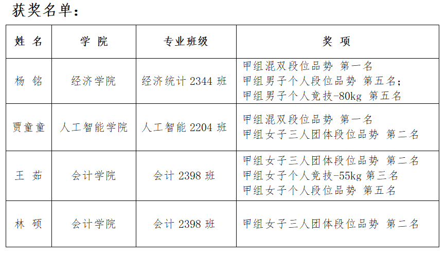 在甲组混双段位品势项目中,杨铭与贾童童历经四轮激战,勇夺金牌;贾童童、王茹、林硕在甲组女子三人团体段位品势项目中团结协作,摘得银牌;王茹在孙老师的战术指导下,沉着应战,在甲组女子-55kg级别的竞技项目中连克强敌,夺得铜牌。同时她在个人段位品势排位赛中成功晋级,荣获第五名;杨铭也在甲组个人品势与个人竞技-80kg项目中双双跻身五强,展现出全面扎实的技术能力。同学们在赛场上全力以赴,彰显了我校学子不畏挑战、奋勇向前的精神风貌。